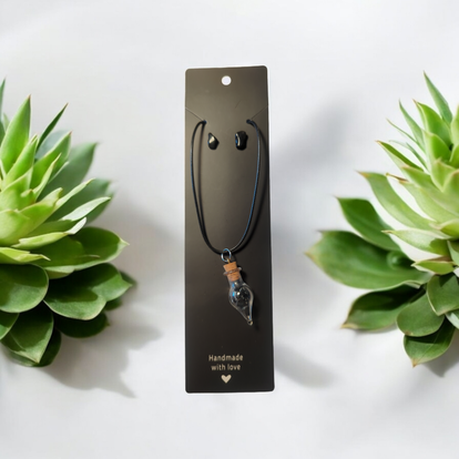 Glass cylinder leather cord necklace filled with natural black obsidian.