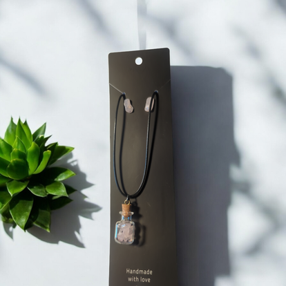 Glass cylinder leather cord necklace filled with natural rose quartz .